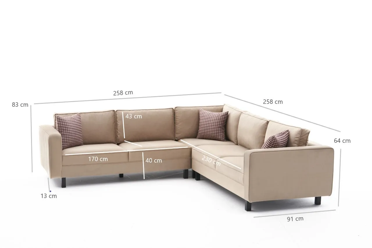 Ürün Ölçüleri: Genişlik : 258 *258 cm Yükseklik : 83 cm Sırt Yükseklik : 43 cm Derinlik : 91 cm : Oturum Derinliği : 60 cm Ayak Yüksekliği : 13 cm Oturum Yüksekliği : 40 cm Kol Kalınlığı : 14 cm İç Genişlik (Kollar Hariç) : 230*230 cm Ürün Özellikleri: Kumaş : Dokuma Kadife, %100 PES kumaş. Sünger : 15 cm 28 DNS Soft Sünger; sırt dolgu minderler kırpıntı sünger ve boncuk elyaf Ayak : Kayın kereste , siyah boyalı ahşap ayak İskelet :Doğal kayın kereste ile panel malzemelerden geçme ve vidalama sistemleriyle üretilmektedir. İskelet : Doğal kayın fırınlanmış kereste ve zıvana geçme ile üretilmiştir. Uygunluk : Çevre ve çocuk sağlığına uygun malzemeler ile üretilmiştir. Paket : Mobilya ambalajı ile paketlenmiş ve toz girmesini önleyici ince naylon ile korunmuştur. Paket Adet : Ürün 3 paket olarak gönderilmektedir. Kurulum : Ürünün sadece ayakları demonte olarak gönderilmektedir. Montaj : Ürün ayaklarını şarjlı tornavida ile monte edebilirsiniz. İçerik : Ayaklar ve bağlantı elemanları ürün paketinden çıkmaktadır.