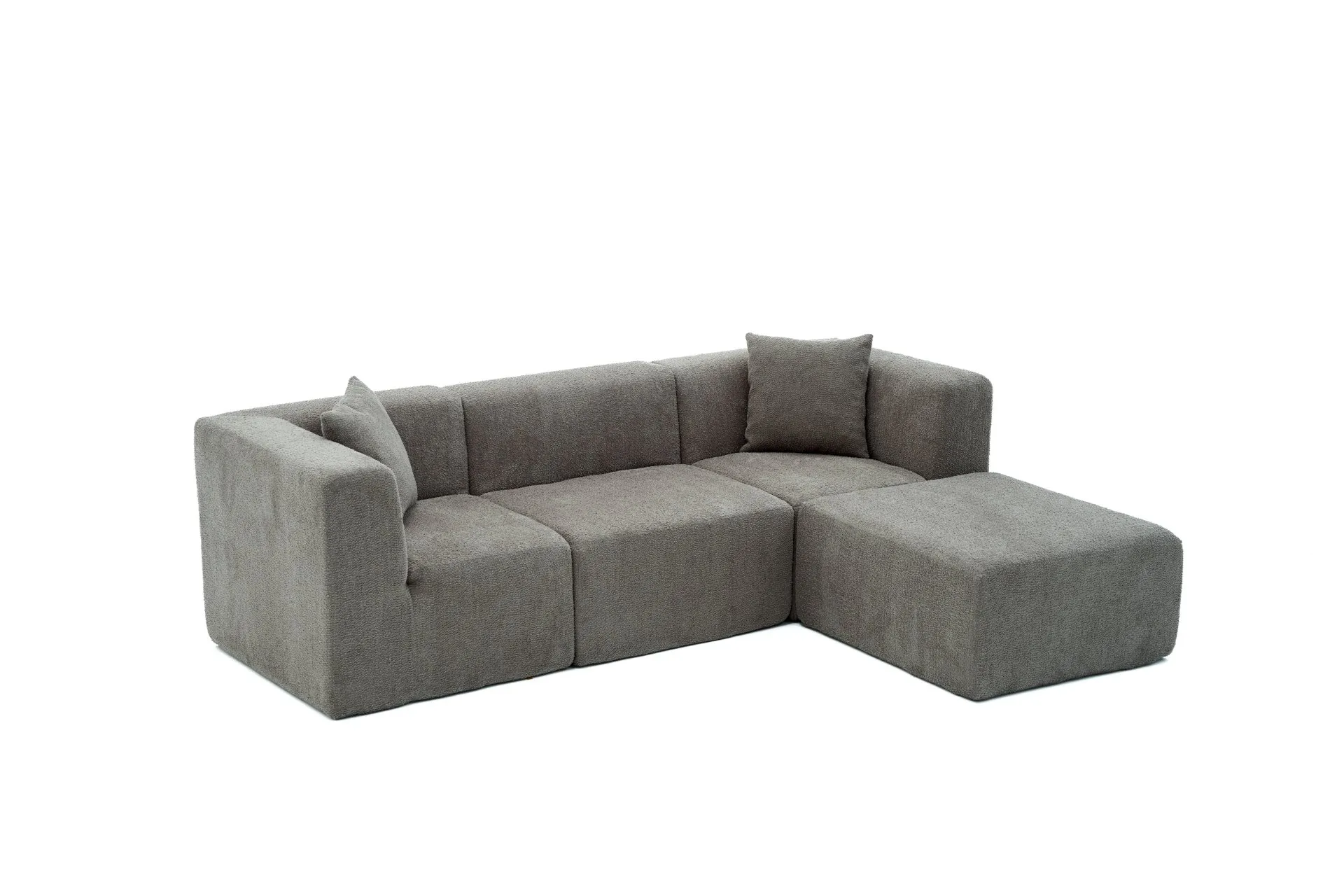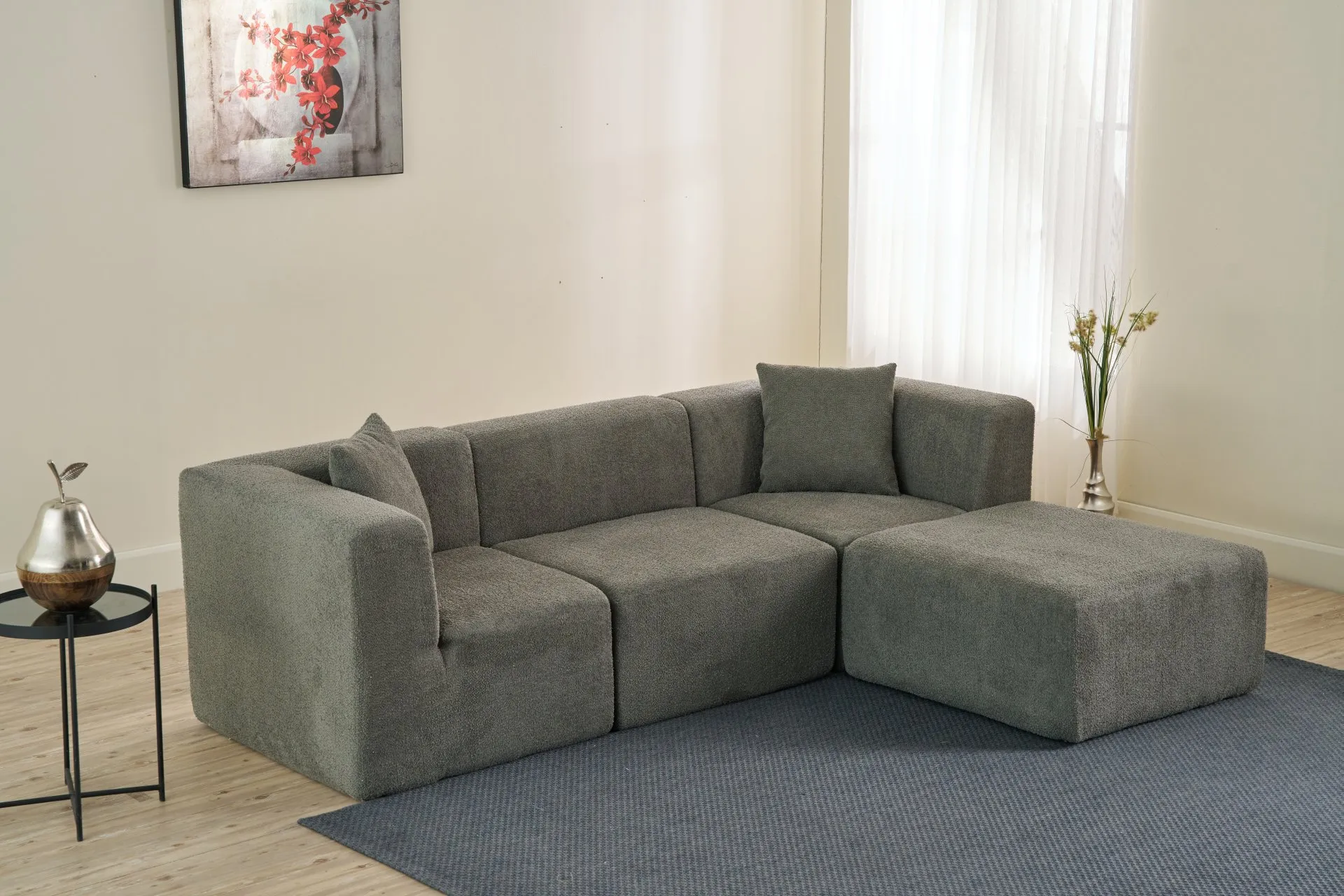 Ürün Özellikleri: Kumaş : % 100 PES dokuma şönil kumaş kullanılmıştır. Sünger : 30 DNS soft yumuşak sünger kullanılmıştır Uygunluk : Çevre ve çocuk sağlığına uygun malzemeler ile üretilmiştir. Paket : Mobilya ambalajı ile paketlenmiş ve toz girmesini önleyici ince naylon ile korunmuştur. Paket Adet : Ürün 4 paket olarak gönderilmektedir. Kurulum : Ürün paketi açıldığında kullanıma hazırdır Tekli kollu Modül Genişlik : 80 cm Derinlik : 85 cm Yükseklik : 70 cm Oturum Gen. : 54 cm Oturum Der. : 60 cm Oturum Yük. : 40 cm Kolsuz Modül Ölçüleri Genişlik : 80 cm Derinlik : 85 cm Yükseklik : 70 cm Oturum Gen. : 80 cm Oturum Der. : 60 cm Oturum Yük. : 40 cm Puf Modül Ölçüleri Genişlik : 85 cm Derinlik : 80 cm Yükseklik : 40 cmGenişlik : 245*165 cm Derinlik : 85 cm Yükseklik : 40 cm Oturum Gen. : 168 cm Oturum Der. : 60 cm Oturum Yük. : 40 cm